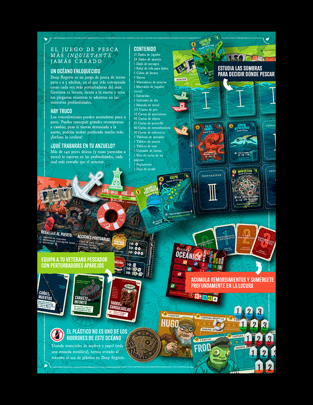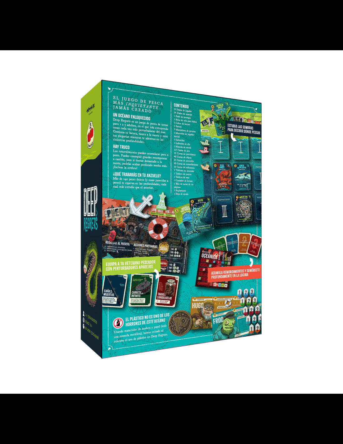 Deep Regrets es un juego de mesa narrativo de pesca con un marcado tono de horror psicológico, donde los jugadores se adentran en aguas cada vez más profundas en busca de peces… y algo más inquietante. A medida que exploras el mar, descubrirás criaturas extrañas, tomarás decisiones difíciles y gestionarás las consecuencias físicas y mentales de tus acciones.